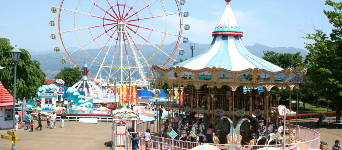 標高460メートルの場所にある小さな子どもも楽しめる遊園地です。豪華な2階建ての「メリーゴーランド」やアップダウンにドキドキする「ネイブルコースター」など大型遊具から、レーサー気分が味わえる「ゴーカート」、見たこともないヘンテコ自転車がそろう「おもしろ自転車」など、気軽に親子で楽しめるアトラクションがそろっています。