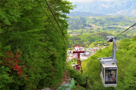 ロープウェイは全長499メートル。見晴駅までの高低差約200メートルを4分間かけて上っていきます。春は新緑やツツジ、秋は紅葉を眼下に眺めながらのんびり空中散歩が楽しめます。山頂にある上ノ山公園内には赤城山や谷川岳を眺める展望台「ときめきデッキ」があり、眼下に広がる温泉街や遠くの山々など絶景が満喫できます。