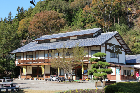 嵩山(たけやま)の麓に建つ道の駅。採れたて野菜を並べる農産物直売コーナーを併設した「たけやま館」では、地元産のそば粉を使用したそば打ち体験(要予約)ができます。打ち立てをその場で食べられるので、ランチがてら体験するのもおすすめです。茅葺き屋根の古民家を移築改造した風情ある「そば処けやき」では、地元産そば粉を使った十割蕎麦が味わえます。