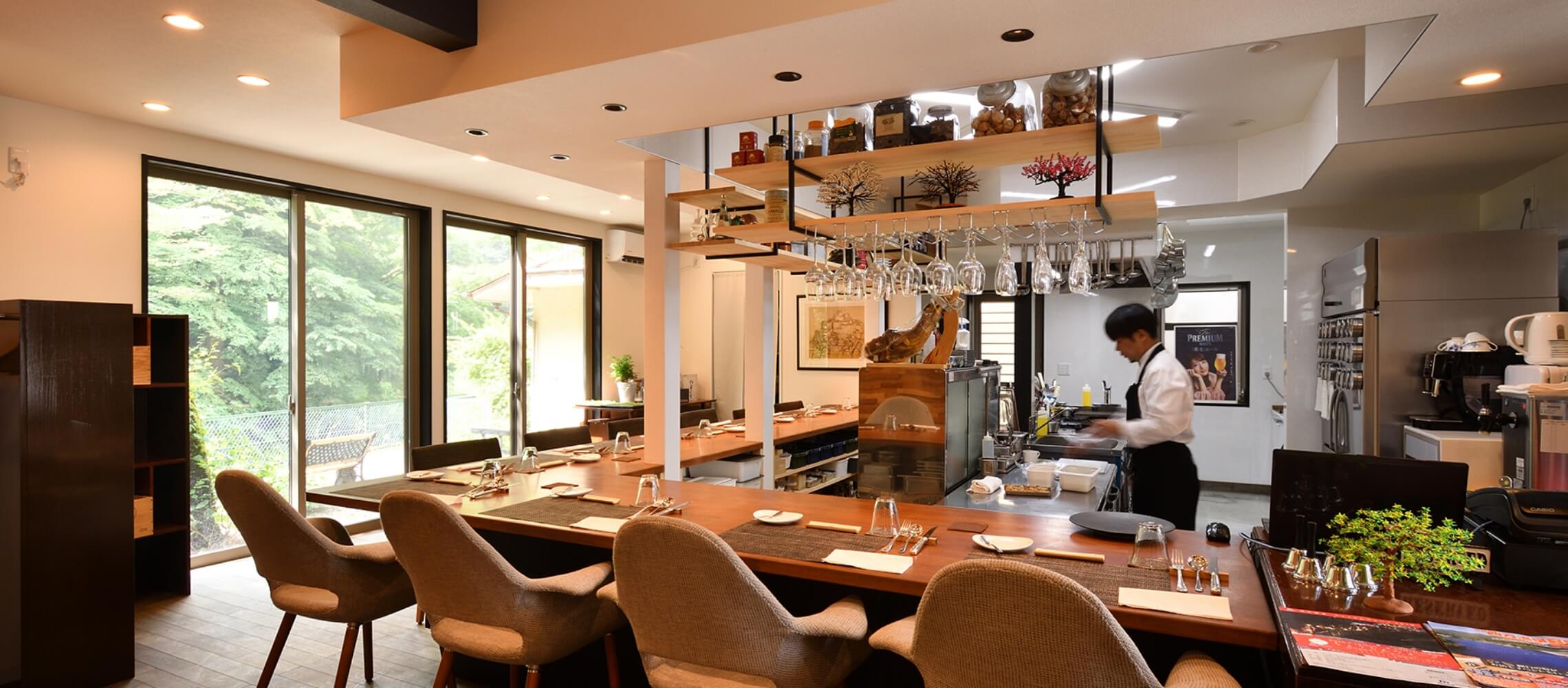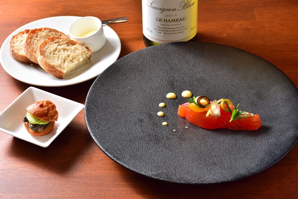 カウンターのみの落ち着いた店内で味わえるのは、こだわりの食材で作る「おまかせコース」。都内のレストランで研鑽を積んだ四万温泉出身のオーナーシェフが作る、目でも楽しめるひと皿がテーブルに並びます。アミューズからメイン、デザートまで、サーブされるごと料理の美しさ、おいしさに会話も広がるはず。グラスワインも用意しているので、料理とワインのペアリグも楽しめます。