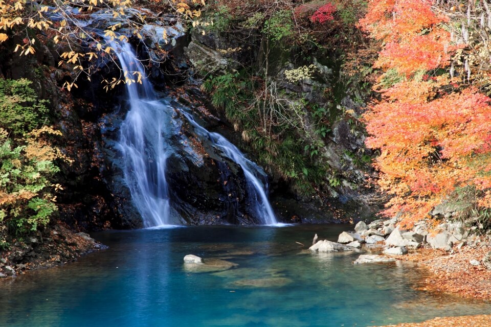 「四万ブルー」と呼ばれる美しい青を静かな滝で眺める