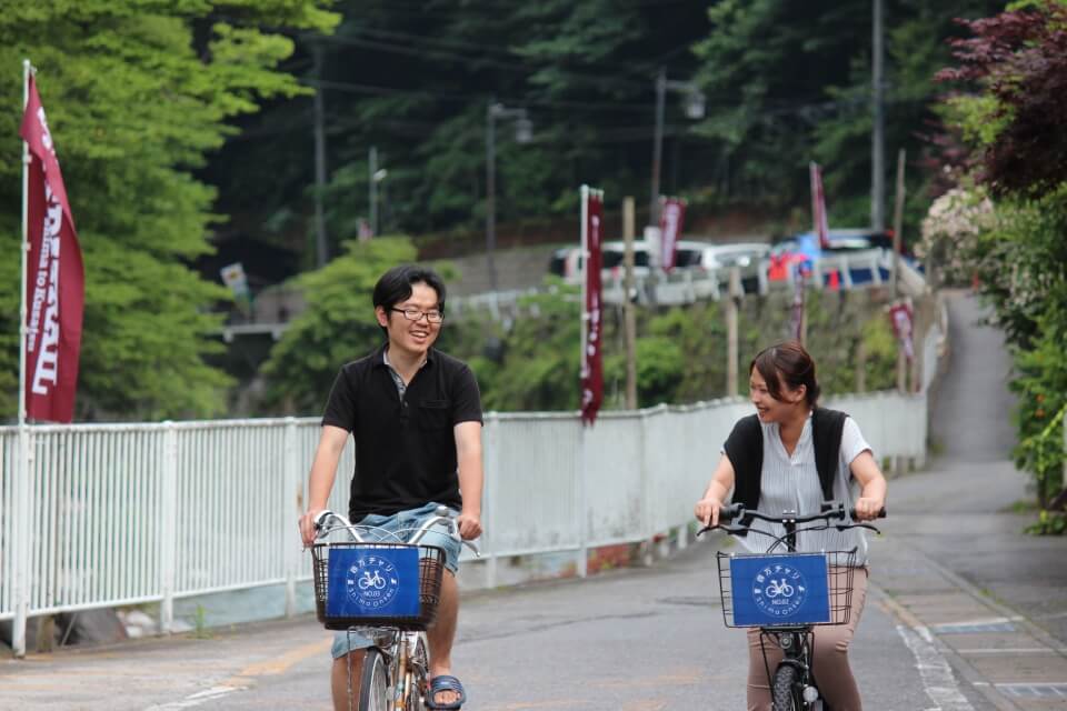 のんびり歩いて温泉街を散策するのもいいですが、ちょっと足を伸ばして足湯や飲泉所、日帰り温泉、奥四万湖へ行きたい。そんなときはレンタサイクル「四万チャリ」がおすすめです。電動アシスト自転車なので坂道もラクラク。車では行けない場所も自転車ならOK。目についた場所に気軽に自転車を停めて、カフェでお茶をしたりランチを食べたり、自由に行動することができます。